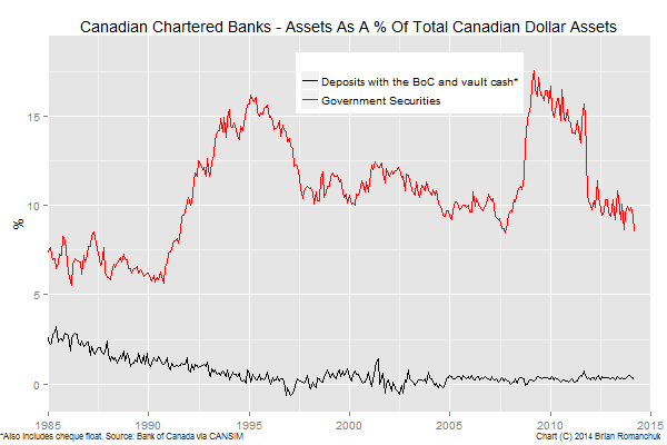 A more accurate characterisation of the situation is to replace "banks lend reserves" with "banks lend against liquid assets". If we look at Canadian Chartered Banks, we see that government securities (at all levels of government, not just Federal government) are typically about 10% of their Canadian dollar assets. (Note that the Canadian banks now have large U.S. dollar subsidiaries, but those operations are run on a matched-currency basis. In other words, we can look at the Canadian-dollar denominated assets and liabilities in isolation.) These holdings provide the liquidity buffer that is used to insure against the loss of deposits. For example, if there was a withdrawal wave leaving Bank A going to Bank B, this could be met by Bank A selling government bonds and Bank B buying them.If we amend Nick Rowe's text in this fashion, there does not appear to be much of a disagreement between us. If there is, it is probably the result of the fact that I do not attach particular significance to "money" versus other governmental liabilities (treasury bonds and bills). Correspondingly, I attach a greater weight to fiscal policy (which determines the amount of government liabilities outstanding) than to monetary policy (which is the split between the monetary base versus other governmental liabilities).