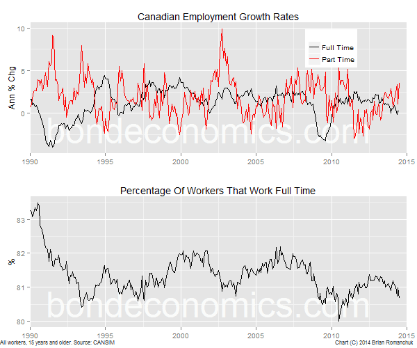 The do-over for the July Labour Force Survey for July 2014 was much better than the first go - 42,000 jobs were created in this version, instead of just 200. But as the chart above shows, the year-on-year growth rate for employment is still below 1%. And the details of the report are less buoyant the aggregate job number suggests, as growth was dominated by part-time positions.