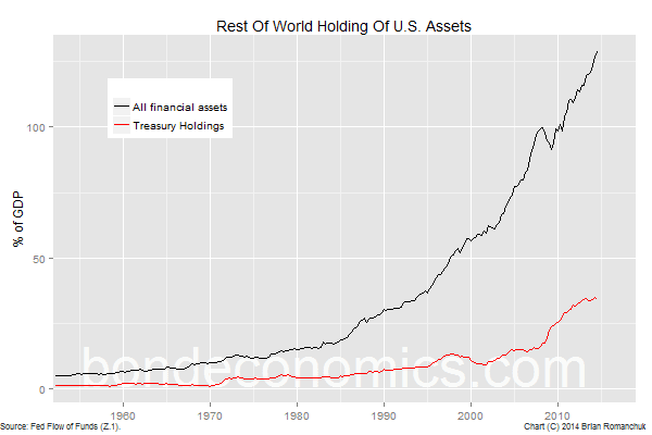 Although I normally focus on domestic considerations when looking at developed economies, the external sector is the 800-pound gorilla of the Treasury market. The United States' perpetual current account deficits create a corresponding need for foreigners to accumulate financial assets within the United States. The chart above shows the "Rest of the World" holdings of U.S. financial assets as well as Treasury securities as a percentage of U.S. GDP. External holdings have risen to around 47% of the Treasury market (as of the second quarter of 2014).