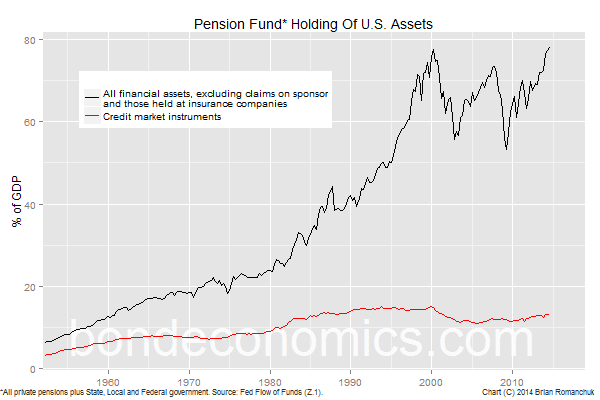 Demographics has driven the desired stock of assets in retirement accounts ever-higher. The chart above shows the level of assets in pension plans of all types - private defined contribution and defined benefit (including 401(k)-style plans), State and Local government pensions, and Federal pensions. I exclude claims on the sponsoring entity - unfunded pension benefits - as well assets held at Life Insurance companies (which are shown below). Since assets are weighted towards equities, the repeated rise and fall of stock prices is evident.