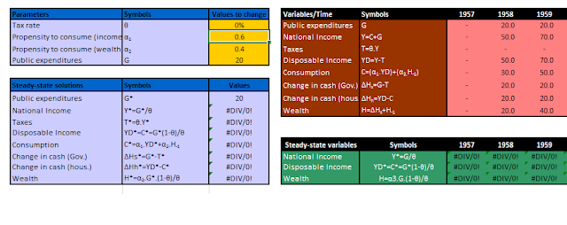 DeleteIt seems to me like the relation "1-α1(1-θ) = X" is the key to making spreadsheet models into sequential flow displays of the economy as it flows through time. SIM begins this, but SIM describes only the initiation of an ongoing economic system. We need the ability to change the theta and alpha parameters "on the fly" to see how GDP and wealth react to changes.