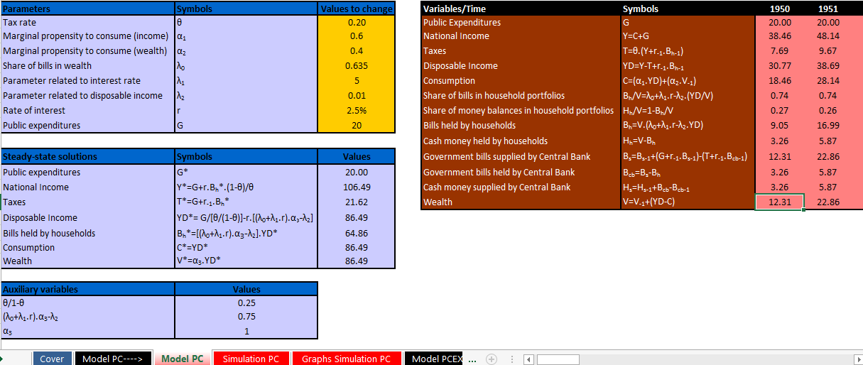 Model PC is found in Chapter 4 of Monetary Economics: An Integrated Approach to Credit, Money, Income, Production and Wealth, by Wynne Godley and Marc Lavoie. This text has become the standard for learning about SFC models. It is a textbook, and so it may be imposing to readers who are less mathematically inclined. This article (and similar ones) aims to give a non-technical overview to the topic; either as an aid to understanding the text, or at least to introduce the basic concepts. The text itself contains a lot of information, which my summaries cannot hope to cover.For those of you without the text, the models are available online at the sfc-models site: http://models.sfc-models.net/ Shown below is a screenshot of the Excel spreadsheet version of model PC. You may be able to relate the variables within the spreadsheet to my diagram (although my labelling might be slightly different).