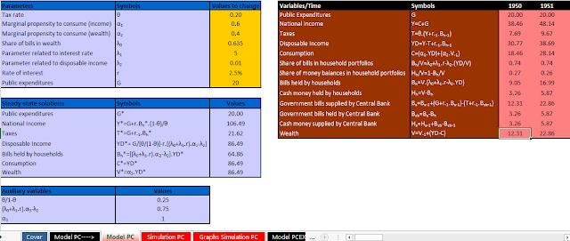 I described Model SIM in the article Finding The Solution In A Simple SFC Model, in which I explained how to find the solution easily for the first time period if we make the assumption that the tax rate is zero. A second article, Techniques For Finding SFC Model Solutions, discusses how the model can be solved with a non-zero tax rate, and for multiple periods. (Essentially, we need to use numerical solution techniques, like the Excel spreadsheet shown above.)