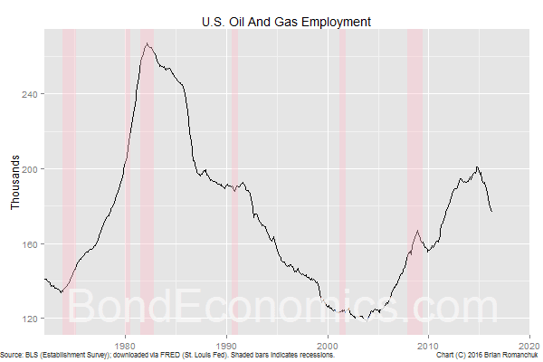 There are certainly sectors of the economy that are weak; the oil and gas industry has been in a sectoral recession for a period of time (chart above). So far, this sectoral weakness has not hit aggregate demand enough to force an economy-wide recession. Although energy sector jobs pay well, there is not enough of them for the job losses there to move the needle of aggregate job growth.