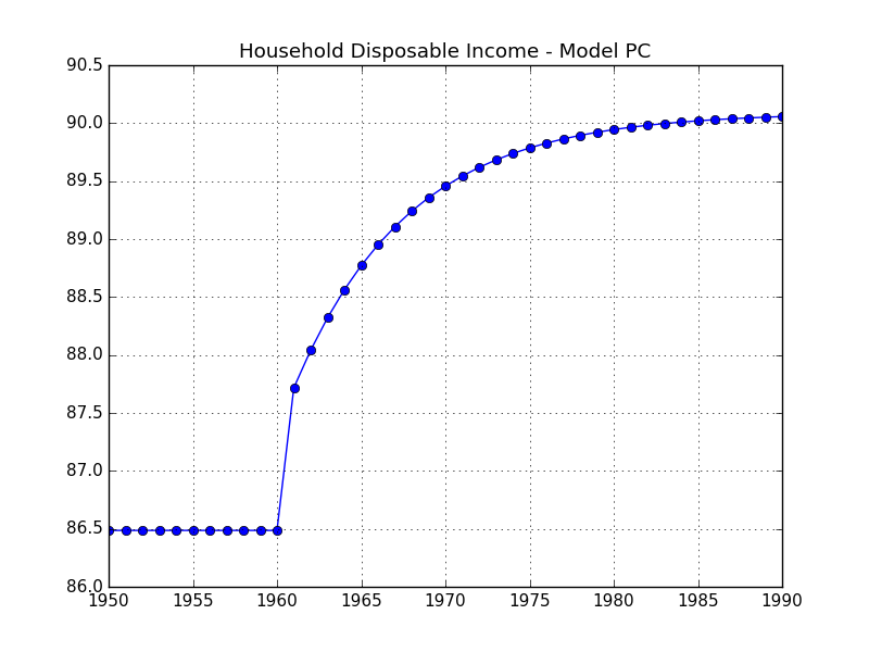 The chart above gives a clue as to why output increases. Within Model PC, the household sector holds Treasury bills (of a one-year maturity, matching the time step). The rise of interest rates in 1960 leads to higher income, and hence higher consumption. There is a multiplier effect on these increase purchases, and so national output rises.