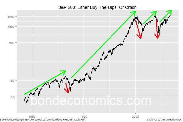 - Occasional crashes that do serious damage to equity returns; typically associated with financial crises (red arrows. Note that I have not added red arrows for some episodes, like the 1987 crash, in order to keep the chart clearer.) Bulls who "buy the dip" too early here get crushed, adding to investor panic.