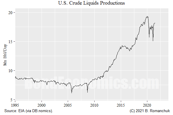 As seen in the chart above, “liquid” production has peaked in the United States (right about when one of the more reliable contrary indicators on Twitter was laughing about Peak Oil). This was somewhat predictable: fracking generates output quickly, but the depletion rate is also rapid. The industry was unable to keep up the frenetic pace of drilling since it was not economic.